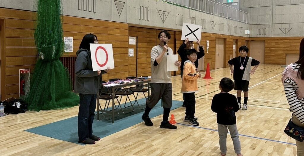 当日は、シニア世代・子ども・保護者が混合チームとなり、○×クイズやジェスチャーゲームなどの交流型レクリエーションを実施。